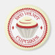 Ein Magnet, der eine Abbildung eines roten Samtkuchens mit weißer Vereisung in einem dekorativen rot-weißen Kreis mit rotem Text enthält.