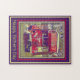 Ein heller und fröhlicher, roter Vintager Camper-Umbau mit Beagle, Happy Vatertag Puzzle. Der Lastwagen ist ein reicher Kirschrot. Auf der Vorderseite des klassischen Lastwagens befindet sich ein Friedensschild, und auf dem Kennzeichen steht "Vintag". Neben dem LKW steht ein gut aussehender und wachsamer Beagle, der für das nächste Reiseabenteuer bereit ist. Die Hauptfarben des Puzzles sind rot, grün und kühn lila. Der glückliche Vatertag ist in Gelb unten.