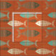 Nutzen Sie dieses Vintage Kitsch-Fisch-Gewebe für eine große Auswahl an Nähprojekten. Das Muster weist einen roten Hintergrund mit braunen, türkisfarbenen und gelben Skelettfischen auf, die mit der Strömung schwimmen.