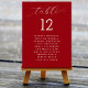 Solide rote Hochzeitskarten mit einer Liste der Gästennamen für jeden Tisch. "Tisch" Text oben in elegantem, wirbelndem Skript. Geben Sie die Nummer jedes Tisches mit allen Namen der Gäste ein, die sitzen werden. Das Design wird auf einem großen Einladungspapier gezeigt, sodass es als Sofortdownload erworben werden kann - oder wählen Sie die Print- und Versandoption aus.