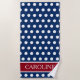 Dieses spaßige Strandtuch bietet klassische weiße Polka-Punkte auf Navy Blue mit einer rot-weißen Band, die Sie mit Ihrem Namen oder speziellen Text personalisieren können. Macht tolle Gastgeschenke für Ihr nächstes Party am Strand oder am Pool!
