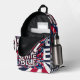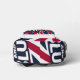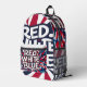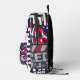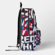 Ein lebendiges und dynamisches Design mit einem spielerischen geometrischen Muster mit den Farben der amerikanischen Flagge. Die rot, weiß und blau gestrichenen Streifen der Fahne sind kunstvoll in abstrakte Formen angeordnet, was ein dynamisches und auffälliges visuelle schafft. Überlagert wird dieses Muster durch die Phrase "Rot, Weiß und Blau", geschrieben in lustiger, skurriler Schrift, die das Gesamtdesign ergänzt. Die Typografie ist kühn und strahlt ein Gefühl von Freude und Patriotismus aus.