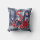 Die farbenfrohen Kissen Amerikas in rot und blau dekorierten Briefen im Stil der Volkskunst mit rotem und blauem Blumenstrauß auf mariniertem Gingham im Schachbrettmuster. Dekoration am Unabhängigkeitstag