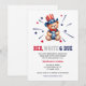 Am 4. Juli Junge Dusche Einladung mit einem Bär, Feuerwerk, Sternen, und dem Text "rot, weiß & due". Personalisieren Sie es mit Ihren Party-Daten, UAWG und Registrierungsdaten. Das hintere Design mit den USA Flaggenfarben. Weiße Rückseite.