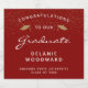 Feiern Sie den Meilenstein Ihres Absolventen stilvoll mit diesen individuellen Abschluss-Schaumweinflaschen-Etiketten, die mit den Worten "Herzlichen Glückwunsch an unseren Absolventen" in weißem Text auf rotem Hintergrund. Das Wort "Graduate" erscheint in einem anmutigen Skript im Handschriftenstil. Ein paar goldene Imitate Glitzer Mörtel-Kappen und eine Streuung von Goldkonfetti schmücken den oberen Teil des Etiketts. Personalisieren Sie es mit dem Namen, der Schule und dem Jahr des Abschlusses.