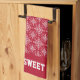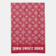 Unser Küchenhandtuch mit roten und weißen Mustern und Text in der Schulschrift. Sehen Sie sich unsere komplette Produktpalette in unserem Zazzle-Shop an.