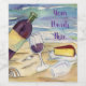 Die Kunst zeigt eine Flasche Rotwein, zwei Gläser Wein und Käse auf einem Sandstrand mit Muscheln. Im Hintergrund brechen die Ozeanwellen. Passen Sie dieses Weinflaschenlabel mit Ihrer personalisierten Nachricht an, um spezielle Weingeschenke zu machen!