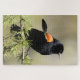 Red Winged Blackbird mit einer Feder außerhalb des Puzzle