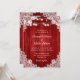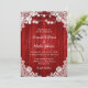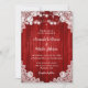 Romantische rote rustikale schicke Hochzeitseinladung mit weißer Blumenspitze und Lichtern auf einem Holzboden. Perfektes Kartendesign für die Einladung Ihrer Gäste zu Ihrer romantischen rustikalen roten Hochzeitsfeier.
