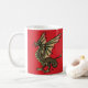 Eine Tasse mit einem mittelalterlichen Wyvern auf einem roten Hintergrund, die Ihre Tasse Tee etwas interessanter macht.