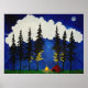 Drucken eines Acrylgemäldes von Jeremy Bonsol. Rote Zelt- und Lagerfeuerszene, die die silbernen Bäume im Vordergrund beleuchten. Sterne und Wolken füllen den Hintergrund, um eine friedliche nächtliche Camping-Szene im Wald zu schaffen.