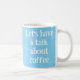 Die hellblaue Tasse mit der Textur des weißen Spritzers sagt: "Lasst uns einen Vortrag über Kaffee halten".