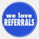 Wir Liebe Referrals auf blau, oder ändern Sie die Hintergrundfarbe, wenn Sie möchten. Lass Ihren Geschäftskunden wissen, dass Sie Empfehlungen schätzen. Die Mitarbeiter können den Knopf als Erinnerung tragen oder den Aufkleber auf Ihren Produkten, Rechnungen oder Korrespondenz mit den Kunden verwenden.