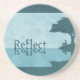Ein grün-blau strukturierter zeichn mit der Silhouette eines Mannes, der unter einem Baum sitzt, durch einen Teich, der darüber nachdenkt. Das Wort "Reflektieren" Erholungen auf der Seeoberfläche, Text und Schatten, die sich im vollkommen stillen Wasser widerspiegeln.