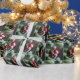 Ein roter Weihnachtsschmuck hängt zart von einem grünen Tannenzweig, der eine weiße Katzenpfote reflektiert