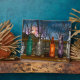 Handgezeichnete Digitalkunst mit bunten Glasvasen im Fensterrahmen wird bei Sonnenuntergang mit niedlichen Kirschvorhängen.