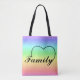 Das Drehbuch sagt "Familie" und es ist mit der Spitze eines Herzens und Set gegen einen farbigen Regenbogen verstrickt, überall auf bedruckten Taschen