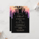 Eine mädchenhafte und weibliche 50. (oder jedes Alter) virtuelle Geburtstagsfeier Einladung. vorne: Ein schicker schwarzer Hintergrund. Dekoriert mit Imitaten regenbogenfarbenen Glitzer Tropfen, Farbe Tropfen in lila, rosa und Imitat Gold und Rose Gold. Personalisieren und fügen Sie einen Namen und Party-Details hinzu. Der Name wird mit handgeschriebenen Stilschriften geschrieben, mit goldfarbenen Buchstaben aus leichter Rose. Zurück: Schwarzer Hintergrund und Imitate Glitzer Tropfen.