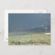 Diese Postkarte hat einen sehr schönen Regenbogen im Hintergrund, der sehr tief bis zum Boden ist und im Vordergrund auch sichtbare Wassertropfen hat.