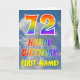 Dieses lustige und farbenfrohe Grußkartendesign aus dem 72. Jubiläum präsentiert einen bewölkten blauen Himmel, zusammen mit einer großen Zahl "72" und der Meldung "HAPPY BIRTHDAY" mit einem inspirierten Farbverlauf in Regenbogenfarben. Die Vorderseite weist auch einen personalisierten Empfängernamen auf. Im Inneren befindet sich eine individuell anpassbare Geburtstags-Grußnachricht, oder vielleicht kann gelöscht und links werden, wenn eine Nachricht von Hand geschrieben werden soll. Eine solche individuelle Geburtstagskarte könnte eine lustige Art sein, Geburtstagswünsche an jemanden zu senden, der seinen siebzigsten 2. Geburtstag feiert. [~Z0000371]