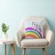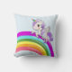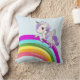Niedliches, farbenfrohes, hellblau geschmücktes Kissen mit Cartoon-Grafik eines lila fliegenden Einhorns auf einem Regenbogen. Passen Sie Ihren eigenen Text an.