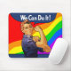 Die Retro Ära Rosie des Klassikers WWII ist der Nieteneinschläger ", das wir ihn tun können" Bild, eine traditionelle Ikone für starke Frauen. Sie wird hier gegen einen gewellter Regenbogen farbigen Hintergrund gezeigt