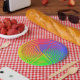Ist hier ein Set bunter PapierTeller mit einem abstrakten gewundenen Regenbogenmuster, das um ein zentrales Ziel in den Farben von Grünem, von Blauem, von Gelbem, Orange und Rot wirbelt.