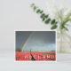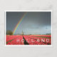 Postkarte eines bunten Regenbogens in einem dunklen Himmel über einer Windmühle und einem Feld voller hellroter Tulpen während eines Frühjahrsturms in einer Landschaft in der Nähe von Amsterdam in den Niederlanden mit einem weißen Rand und dem Text: Holland.