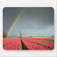 Mousepad mit einem bunten Regenbogen in einem dunklen Himmel über einer Windmühle und einem Feld voll der hellen roten Tulpen während eines Frühlingssturms in einer Landschaft nahe Amsterdam in den Niederlanden.