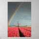 Vertikales Plakat eines bunten Regenbogens in einem dunklen Himmel über einer Windmühle und einem Feld voller leuchtend roter Tulpen während eines Frühjahrssturms in einer Landschaft in der Nähe von Amsterdam in den Niederlanden.