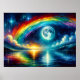 Eine Abbildung eines glitzernden Regenbogens über dem Mond.
