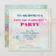Generische Party Einladung. Dieses aufregende musikalische Themenbild ist ein trendiges Retro-Design eines pastellfarbenen Regenbogens mit dunkelfarbigen Musiknoten auf Stücken von Notenmusik, die nach außen explodieren. Schmetterlinge und Spritzer scheinen aus der Mitte auszubrechen. Der Hintergrund ist verblasst, dunkelgrün, Vintag, schattige Grunge-Textur mit verblasster Handschrift. Es wäre ein phantastischer Kauf für Musikfans aller Art.