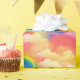 Helle und farbenfrohe Muster zeigen Regenbögen, die über flauschige Wolken gegen einen pulsierenden Himmel ragen. Das wiederholte Motiv schafft einen skurrilen und fröhlichen Hintergrund.