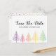 Rainbow Farben farbenfrohe Bäume und Konfetti Homosexuelle Hochzeit Speichern Sie das Datum Postkarte, mit einer bunten Bäume und Polka Punkte in Regenbogenfarben auf weißem Hintergrund.