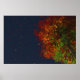 Schauen Sie im Herbst durch die Äste eines Hochbaumes hinauf. Die herabfallenden Blätter Bordeaux, Rot, Gold, Orange, Gelb und Blau funkeln gegen den tiefblauen Himmel.