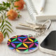 Abstraktes geometrisches Design der Interlacing-Kreise, helle Regenbogenfarben auf schwarzem Hintergrund