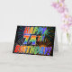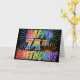 Die Vorderseite dieses aufregenden, lebendigen und auffälligen Grußkartendesigns weist ein farbenfrohes Muster auf, das von feierlichen Feuerwerken inspiriert wird, zusammen mit der Meldung "HAPPY 74. BIRTHDAY!" mit einem farbenfrohen Regenbogenmuster auf schwarzem Hintergrund. Im Inneren befindet sich eine personalisierte Begrüßungsnachricht, oder man könnte sie löschen und leer verlassen werden, wenn eine Nachricht von Hand geschrieben werden soll. Eine solche Grußkarte könnte ein glücklicher, lustiger Weg sein, jemandes 74. Geburtstag zu bestätigen. [~Z0000355]
