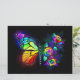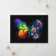 Regenbogen, leuchtend, künstlerisch bemalt Monarchen Schmetterling mit einem Bouquet aus glänzenden, hellen, leuchtenden Rose auf schwarzem Hintergrund. Regenbogenschmetterling.