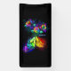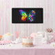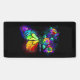 Regenbogen, leuchtend, künstlerisch bemalt Monarchen Schmetterling mit einem Bouquet aus glänzenden, hellen, leuchtenden Rose auf schwarzem Hintergrund. Regenbogenschmetterling.