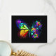 Regenbogen, leuchtend, künstlerisch bemalt Monarchen Schmetterling mit einem Bouquet aus glänzenden, hellen, leuchtenden Rose auf schwarzem Hintergrund. Regenbogenschmetterling.