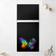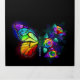 Regenbogen, leuchtend, künstlerisch bemalt Monarchen Schmetterling mit einem Bouquet aus glänzenden, hellen, leuchtenden Rose auf schwarzem Hintergrund. Regenbogenschmetterling.