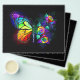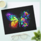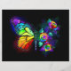 Regenbogen, leuchtend, künstlerisch bemalt Monarchen Schmetterling mit einem Bouquet aus glänzenden, hellen, leuchtenden Rose auf schwarzem Hintergrund. Regenbogenschmetterling.