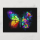 Regenbogen, leuchtend, künstlerisch bemalt Monarchen Schmetterling mit einem Bouquet aus glänzenden, hellen, leuchtenden Rose auf schwarzem Hintergrund. Regenbogenschmetterling.