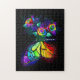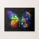 Regenbogen, leuchtend, künstlerisch bemalt Monarchen Schmetterling mit einem Bouquet aus glänzenden, hellen, leuchtenden Rose auf schwarzem Hintergrund. Regenbogenschmetterling.