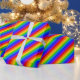 Eine Rolle von sieben farbigen Regenbogenstreifen Umwickeln Papier in kleinen Streifen auf der Diagonale in den sieben Regenbogenfarben Rot, Orange, Gelb, Grün, Blau, Indigo, Violett, auch bekannt als RoyGBiv und Roygbiv. Die längste Rolle ist 4,5 m, die Rollen länger werden in mehreren Rollen von 4,5 m Länge bedruckt.