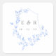 Elegante Hochzeitsaufkleber mit einem hellblauen Schild-Wappen mit Aquarellblau-Blätter, in der Mitte Ihr Mono- und Hochzeitstag grau.
