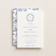 Regency Blue Monogram Wappen, Einladung zur Hochzeit. Vintag inspiriert Regency-Era Barocklinie Art Monogramm Wappen. Features, eine elegante blaue Typografie Design Stil Mix aus Skript und fett-Typ. Chinoiserie Stil Gartenmuster Rückenlehne.
