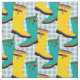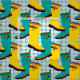 Farbenfrohe Galoshs oder Gummiregenstiefel in hellgelben und türkisfarben sind in diesem skurrilen Set gegen geflieste abstrakte Schirmformen zu finden.
