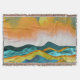 Abstrakte Landschaft von einer Bergvista mit sanften Hügeln und einem Regensturm in Orange, Gold, Blau und Cyan.