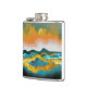 Abstrakte Landschaft von einer Bergvista mit sanften Hügeln und einem Regensturm in Orange, Gold, Blau und Cyan.